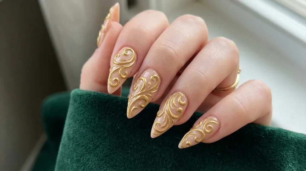 Raised 3D gold swirls on a nude stiletto base. This leans into artistry — the gold isn’t just color, it’s texture and shape. It reminds me of vintage jewelry details translated into nail art.