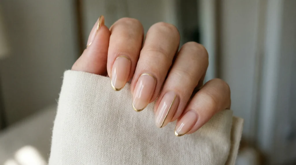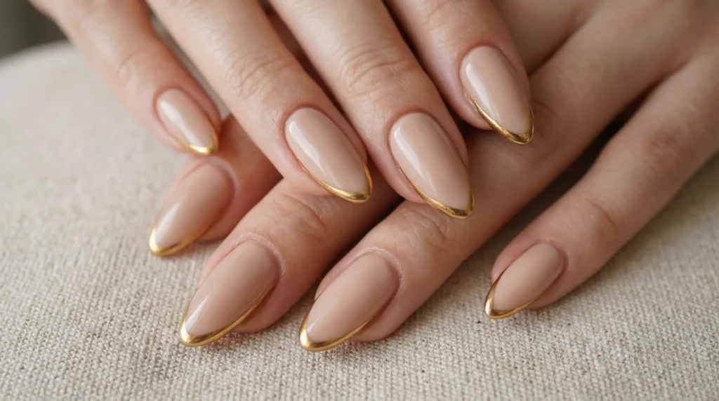 Neutral nude nails with gold chrome applied only along the perimeter. Not on top — along the edges. It creates a subtle framing effect that elongates fingers and reads almost architectural.