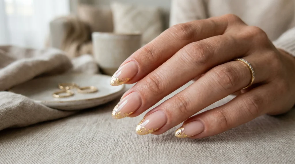 A translucent nude base with irregular gold leaf dusted at the tips instead of a clean line. The gold breaks and fades naturally, giving the manicure movement rather than stiffness.