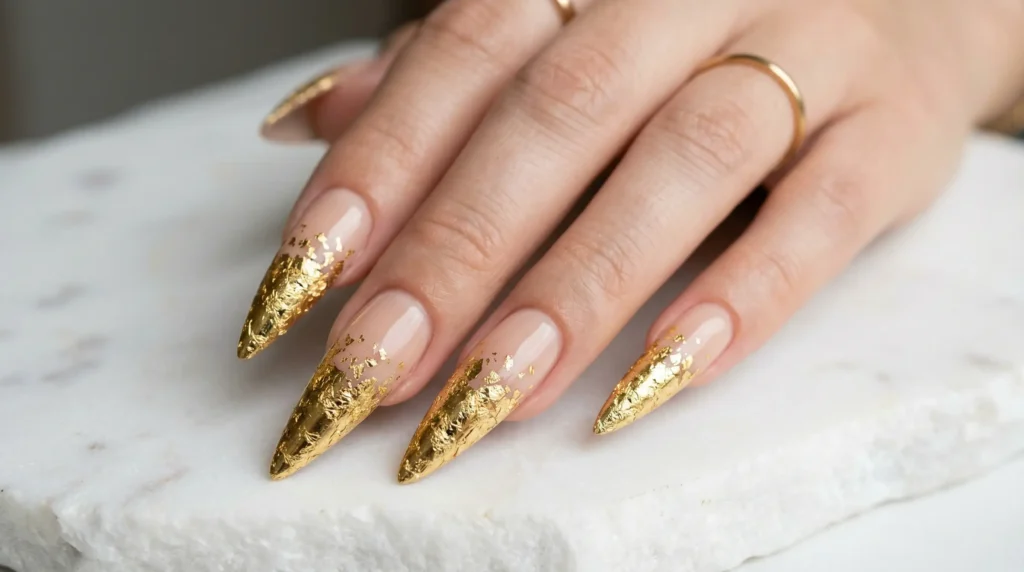 16. Sharp Stiletto Nude with Dense Gold Foil Tips