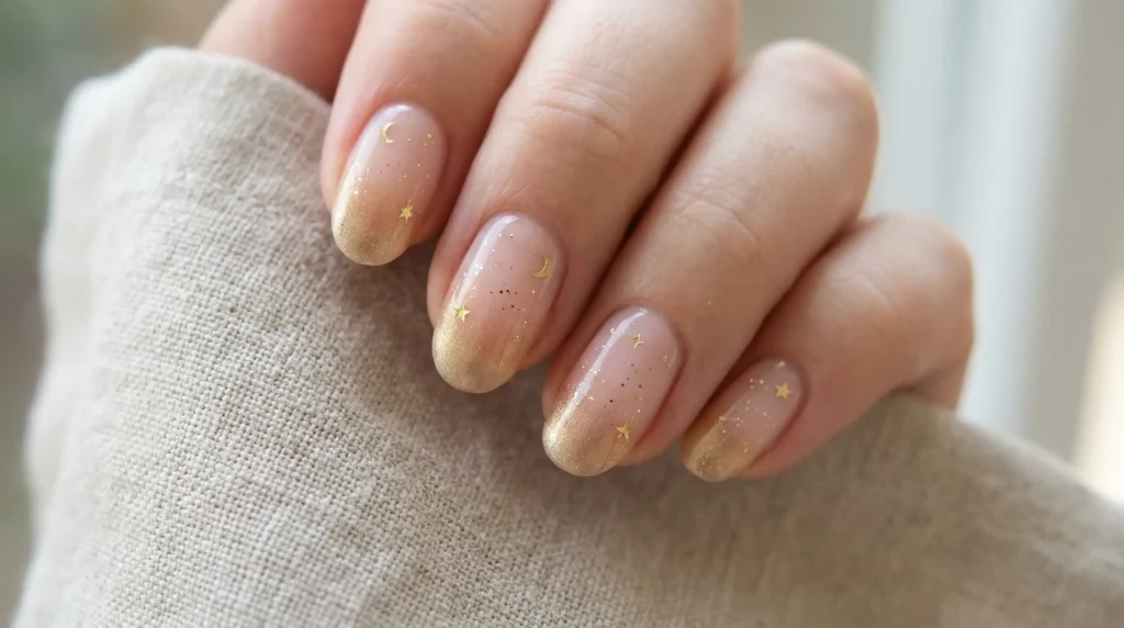 A sheer blush base, soft gold gradients toward the tips, and tiny star accents placed almost accidentally. Up close, it’s magical. From far away, it just looks clean and polished.