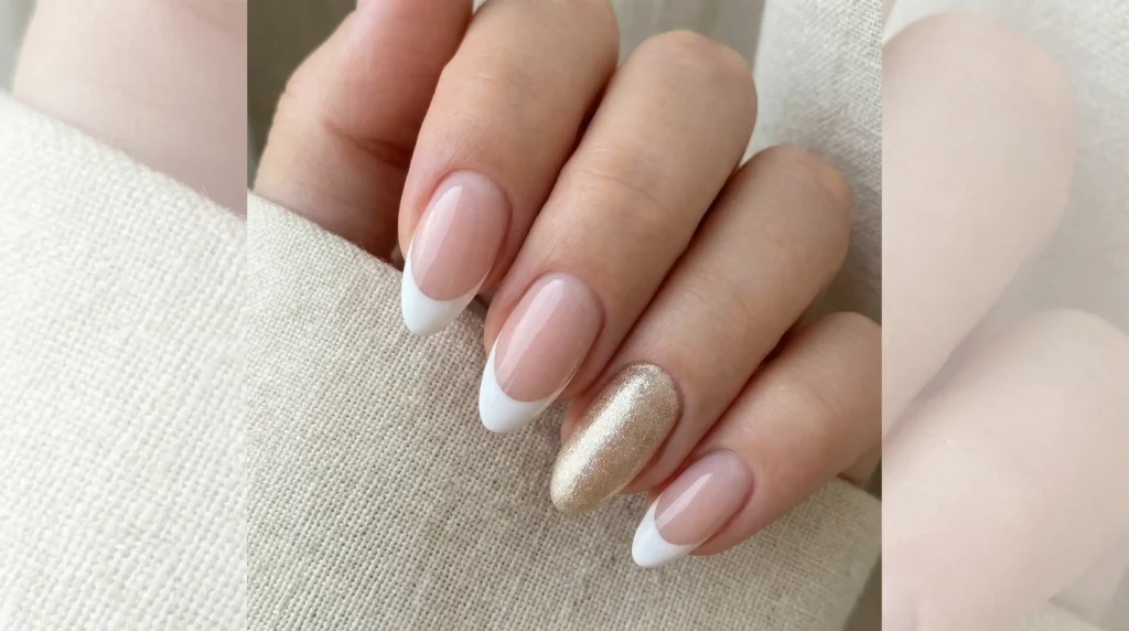Classic almond nails with sheer pink bases and white tips. One nail gets a soft gold shimmer gel instead. Just one. That’s it.