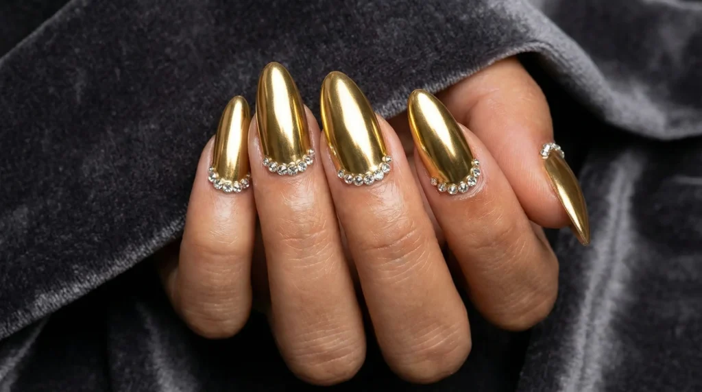 Now here’s where it gets genuinely glamorous. Full-coverage mirror gold nails with small crystals lined along the cuticle. It looks like jewelry has been built directly onto your nail.
