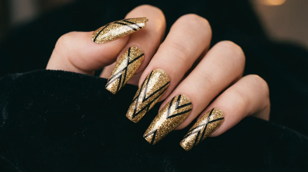 10. Diagonal Gold Glitter with Graphic Black Lines