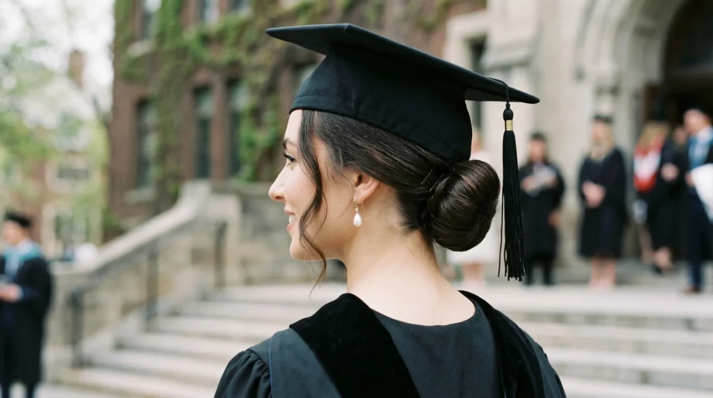 Sometimes the most elegant graduation hairstyle is also the most understated — and a classic low bun is the proof. Smoothed back neatly, compact at the nape, no loose sections competing for attention. The cap sits perfectly. The style holds perfectly. And when the cap comes off, the bun still looks polished enough for the best dinner of the year.