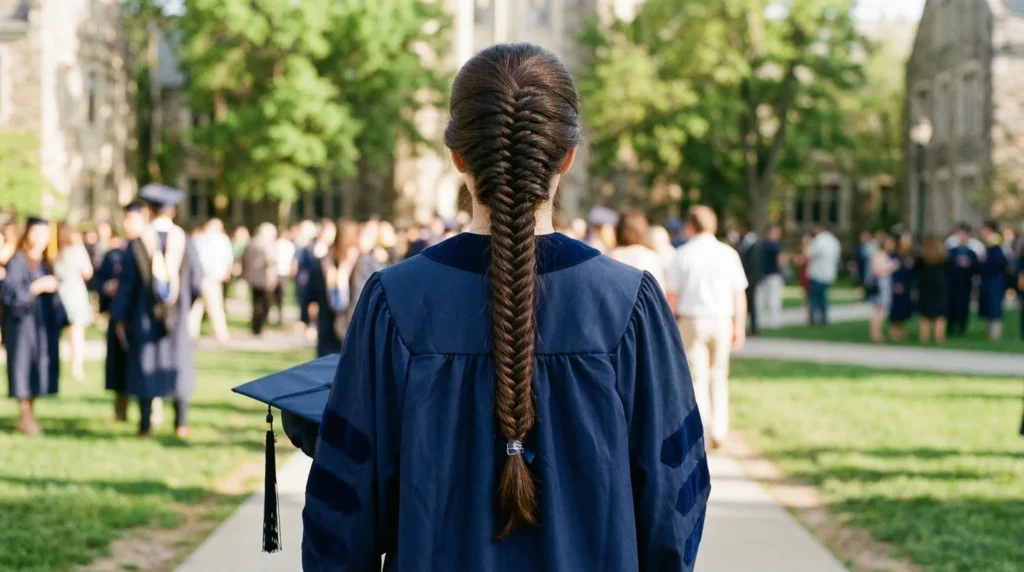 Here’s the detail worth planning for: fishtail braids have a specific reveal quality. During the ceremony, the braid runs straight down beneath the cap and robe. The moment the cap comes off, the full intricate pattern becomes visible — and it’s consistently the hairstyle that gets the most comments at post-graduation dinners.
