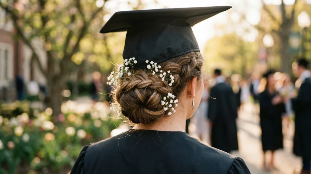 Sometimes graduation hair feels most special when it carries a little romance. This soft braided bun sits comfortably at the nape of the neck — loose woven sections wrapping into a full, airy shape — with delicate baby’s breath woven along the braid line. That small floral detail adds a dreamy, springtime charm that transforms a simple updo into something genuinely memorable.