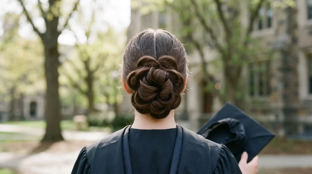 This hairstyle looks intricate at first glance but is actually built on a clever, repeatable technique. Several smooth loops of hair overlap like soft petals at the back of the head, creating a sculptural, dimensional shape that stays compact enough to sit comfortably under a graduation cap — and then looks genuinely impressive the moment the cap is removed.