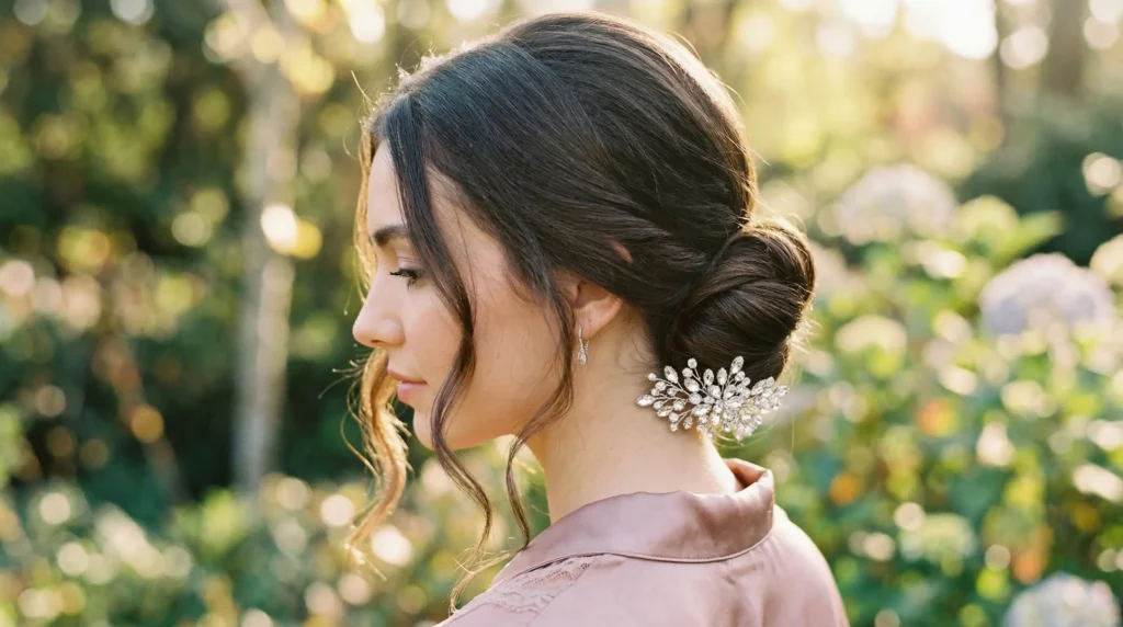 Prep with Bumble and Bumble Thickening Dryspun Texture Spray — freshly washed hair is often too slippery for braids and buns to hold. Attach flowers with discreet pins so they stay secure during the ceremony but remove easily afterward. Celebrity stylist Justine Marjan has noted that small accessories can transform a simple updo into something memorable — and this style proves that completely.