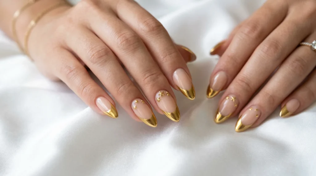 If you’re going for drama — the good kind — gold-tipped almond nails are your answer. A sheer neutral base, metallic gold tips with mirror-like shine, and tiny gold star embellishments near the cuticle. Festive, bold, and still chic.