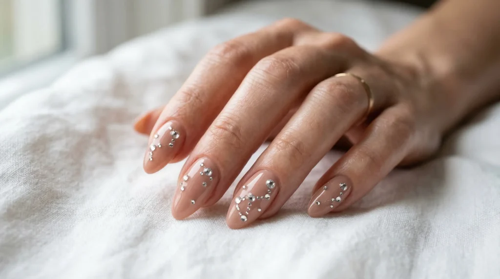 This one sits right at the intersection of simple and luxurious. A warm beige-pink base with scattered rhinestones placed like a constellation across each nail. No intense art, no complex shapes — just light-catching gems that make the whole manicure feel elevated.