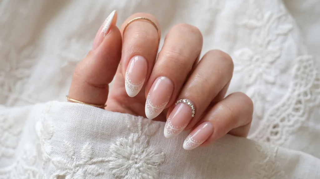 This is the couture option on the list. Soft almond nails in a sheer blush base, finished with modern French tips and delicate white lace detailing along the edge. A row of tiny crystals on one nail adds sparkle, but the design stays graceful and understated throughout.