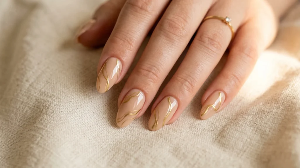 15. Minimalist Nude Nails with Fluid Gold Line Art