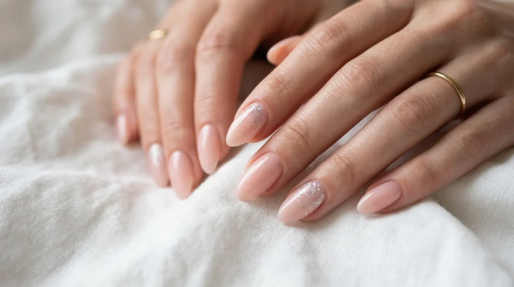 For the base, something like OPI Bubble Bath or The GelBottle Dolly BIAB works beautifully. The key is restraint with the glitter — apply it only to two or three accent nails, not all ten. Less is more here, and the result ends up looking genuinely elegant.