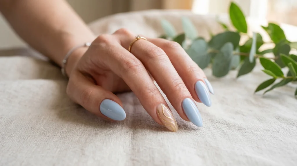 The blue base — something like OPI It’s a Boy or DND Blue Mist — gives the nails a cool, fresh feel. Then the gold wave detailing on a sheer nude accent nail adds a little richness without going over the top. The gold catches the light beautifully in outdoor photos, which is a bonus.