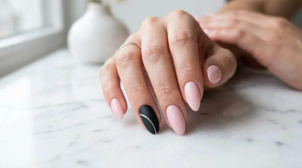 You’d start with a pale pink gel, like OPI Bare My Soul or DND Pink Daisy, and then paint one nail in a deep matte black. A single curved silver line drawn across the black nail using a micro liner brush completes the look. That’s genuinely it.