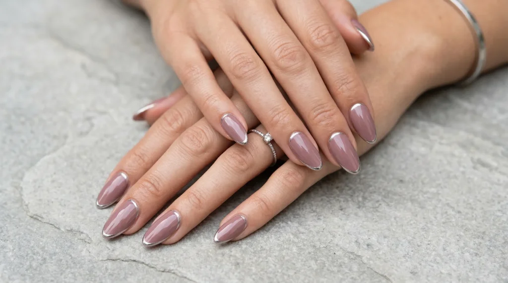 6. Chrome-Edged Mauve Almond Nails
