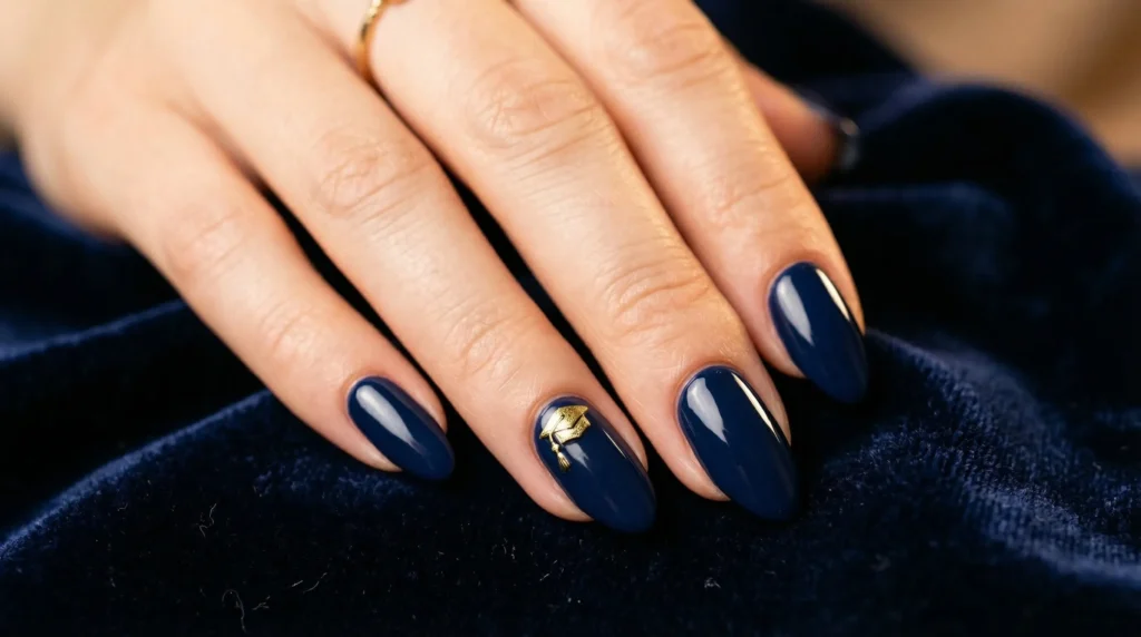 Now here’s where it gets really fun. Deep navy nails with tiny gold graduation cap accents — it’s literally a wearable celebration of the day itself. The contrast between rich blue polish and metallic gold details catches the eye immediately without being overwhelming.