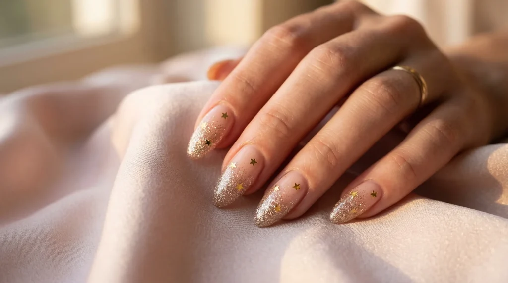The technique isn’t as complicated as it looks. After applying a neutral base — OPI Put It In Neutral or DND Pink Frosting work great — you gently tap fine champagne glitter onto the tips using a sponge or brush to create that fading ombre effect. Then place tiny metallic star sequins individually before sealing with a thick glossy top coat.