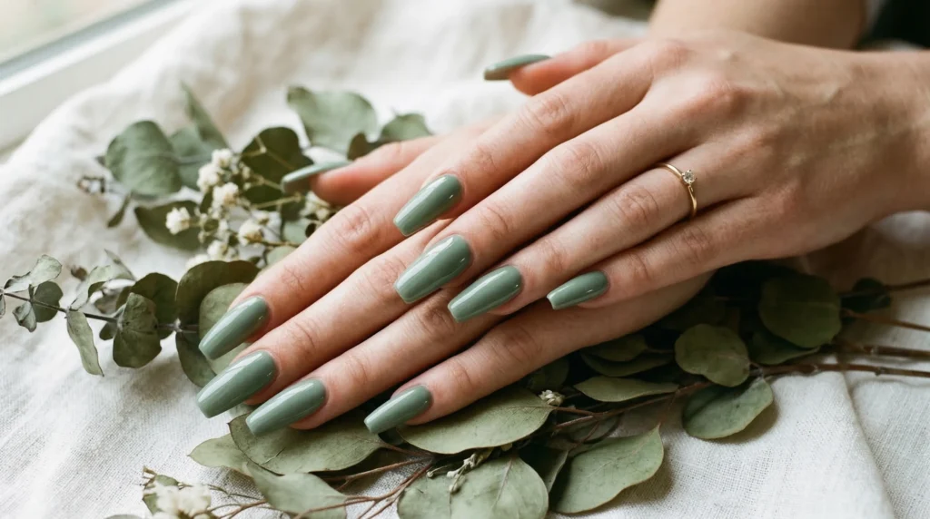 Gel polishes like OPI Sage Simulation or DND Green Tea have that perfect creamy finish — rich without being bold. Pair it with a high-gloss top coat and the color gets even more depth. It’s the kind of nail that makes people ask, “what color is that?”