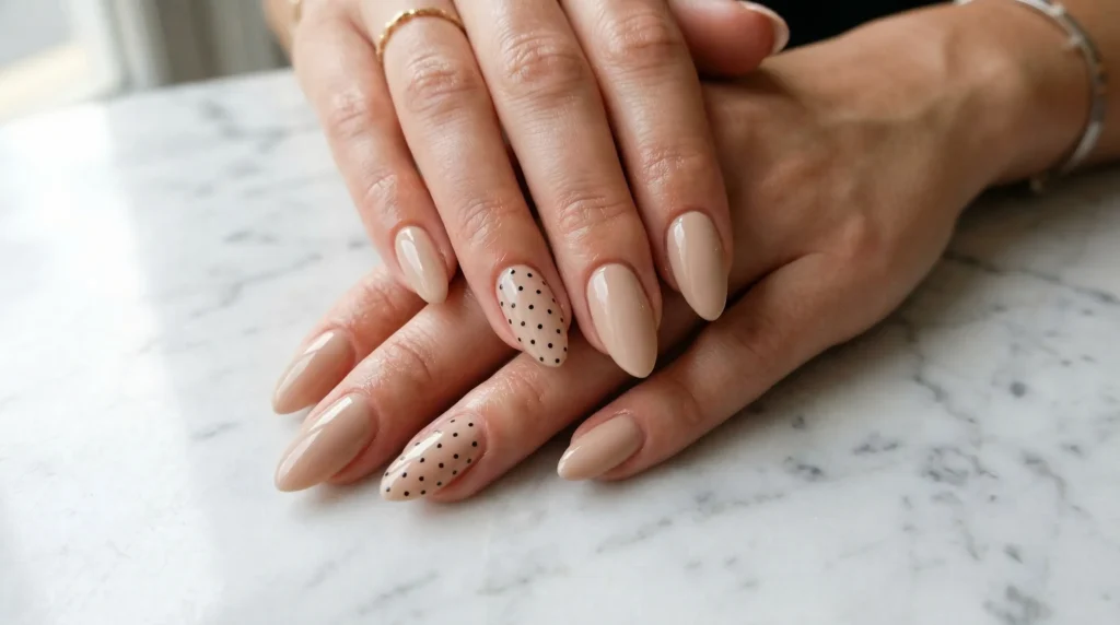 Let’s start with something that works for almost everyone. A glossy neutral base on almond-shaped nails is already pretty polished. But add tiny black polka dots on one accent nail, and suddenly you’ve got personality too.