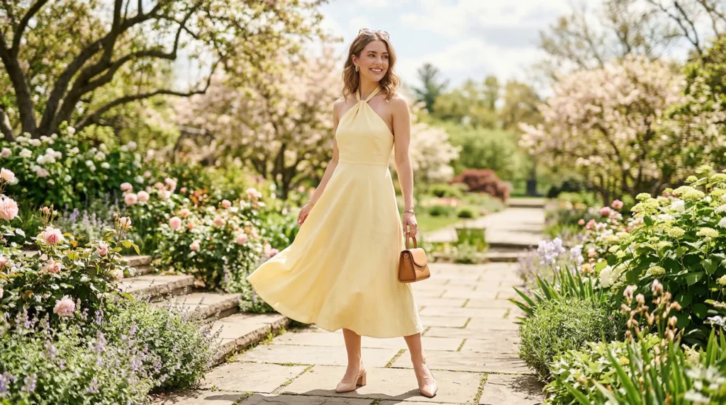 This halter-neck midi dress in a soft pastel yellow tone is genuinely lovely. The fitted bodice and softly flared skirt create a classic silhouette that feels elegant without being stiff. Neutral pointed heels, a small structured bag, and delicate sunglasses keep the focus on the dress itself.