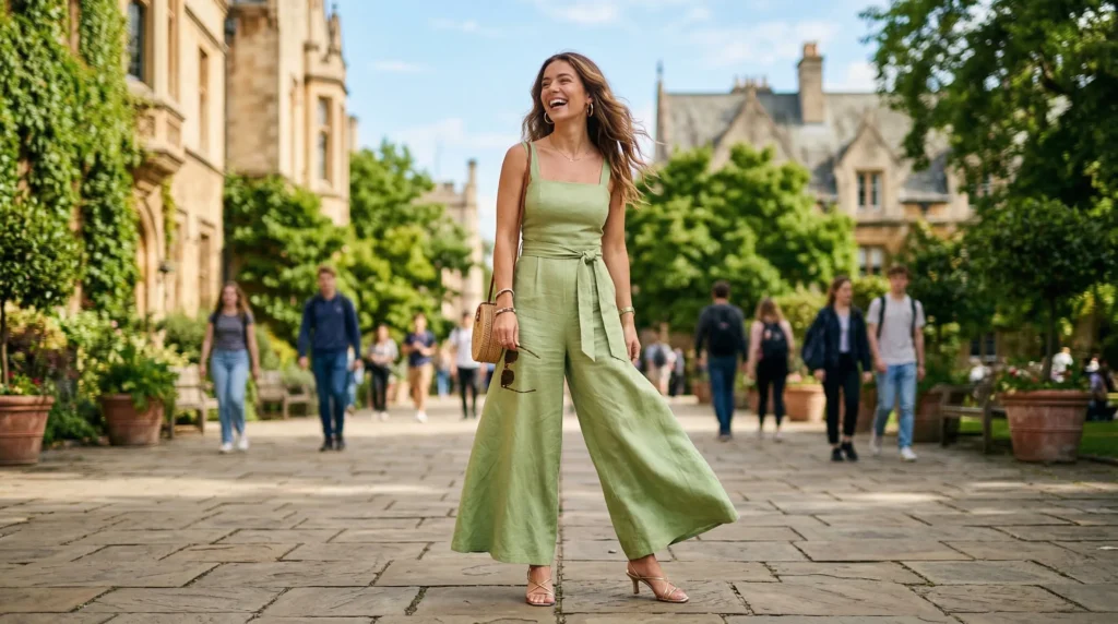 What I love about this look is how the color does so much of the styling work. Pistachio green is fresh, modern, and completely in step with graduation guest fashion trends 2026 — it’s celebratory without being loud. And a jumpsuit in this silhouette is just as elegant as most dresses while being far more comfortable to move around in.