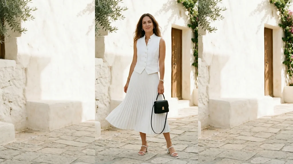 The architectural tailoring of the vest creates a defined waistline, while the softness of the pleats balances it out beautifully. Classic white heels and a compact black handbag round out the look — the bag’s contrast is exactly what keeps the all-white palette from feeling flat.