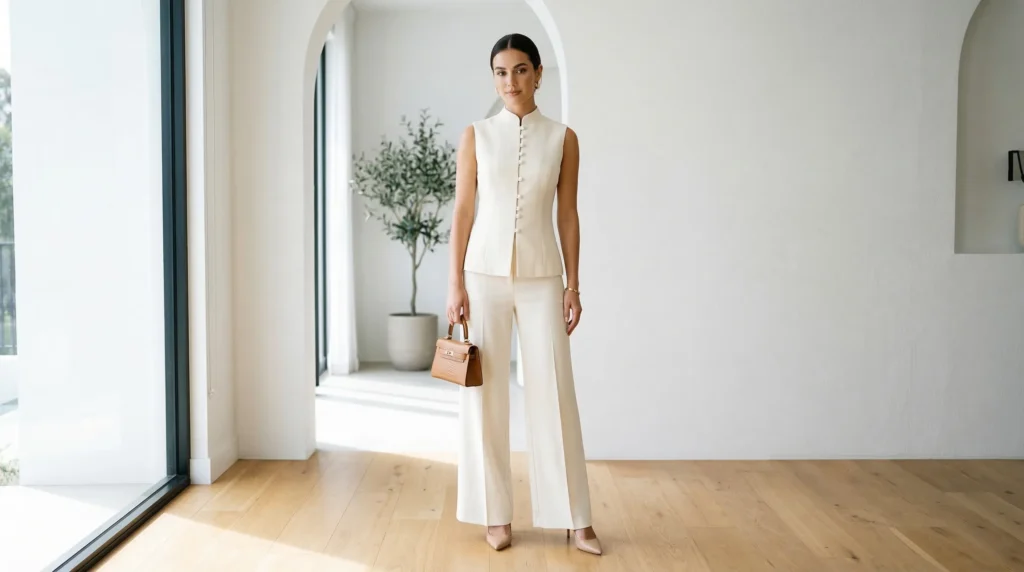 There’s a quiet confidence to a well-cut neutral set, and this cream mandarin collar ensemble captures it perfectly. The structured sleeveless top with decorative buttons and the wide-leg trousers create a seamless silhouette that feels modern without being trendy — the kind of outfit that photographs beautifully now and still looks good in five years.