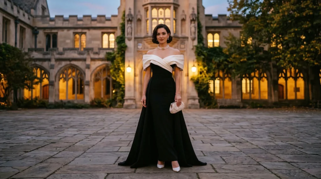 If the graduation you’re attending leans more formal — or if there’s an evening reception afterward — this is the look. A floor-length black gown with a contrasting ivory off-shoulder neckline feels sophisticated, dramatic, and beautifully composed all at once.