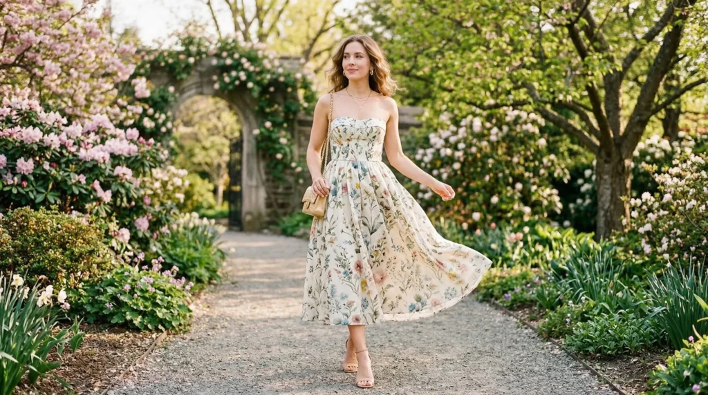 For anyone drawn to softer, more romantic dressing, a strapless midi dress in a light botanical print feels incredibly fitting for spring graduation ceremonies. The structured bodice creates a flattering shape, while the softly flared skirt adds movement and elegance that’s perfect for outdoor events.