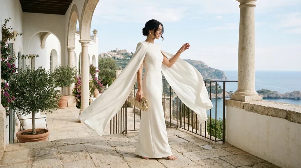 Cape sleeves are having a real moment, and for good reason. This ivory dress with cape-style sleeves feels refined, architectural, and genuinely special — the kind of outfit that turns heads without being loud about it.