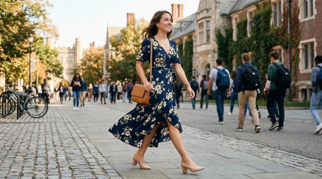 What I love about wrap dresses for events like this is the practicality. They’re easy to dress up or down, they move freely, and they work for a wide range of venues. As a graduation guest outfit choice, this one is about as reliable as it gets.