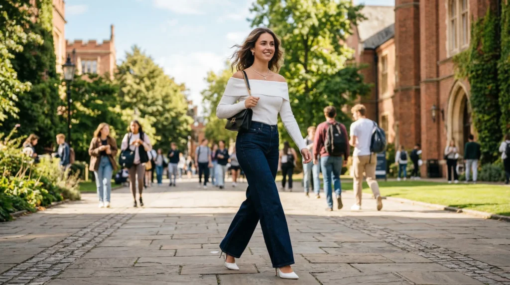 Let’s start with one of the most wearable graduation outfit ideas for guests 2026 — and honestly, one of my personal favorites. A soft off-the-shoulder white long-sleeve top paired with high-waisted dark wide-leg jeans. It sounds simple, but the result is genuinely polished.