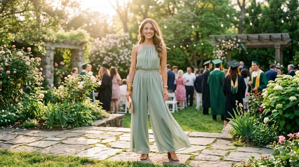 We’re ending the list with one of the most effortlessly beautiful looks here. A sage green halter jumpsuit with a gathered neckline and wide-leg trousers creates a silhouette that’s graceful, comfortable, and genuinely stunning for outdoor graduation settings.
