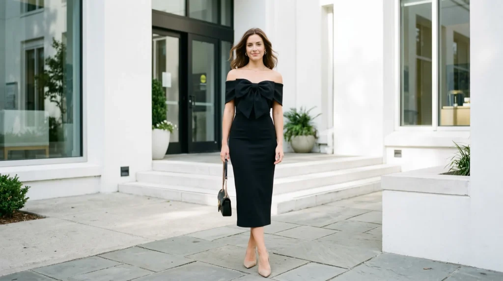 A black dress might seem like the obvious choice — but the right one never gets old. This fitted off-shoulder midi dress with a soft fabric bow near the neckline hits that perfect balance between minimalism and femininity. It’s simple, but it feels special.