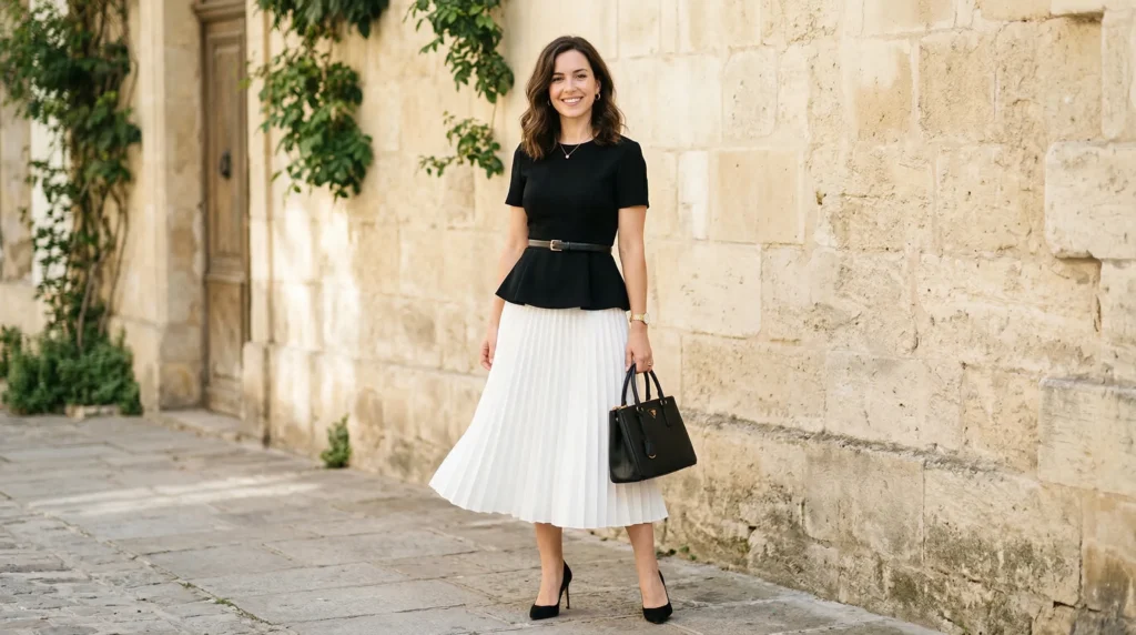 Black and white never goes out of style. Pairing a structured black peplum top with a flowing white pleated midi skirt creates a look that’s both timeless and surprisingly fresh. The peplum detail defines the waist naturally, while the pleated skirt adds graceful movement — it’s a combination that’s genuinely flattering on a wide range of body types.