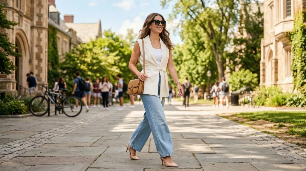 For a more fashion-forward take on graduation guest dressing, a sleeveless tailored blazer over wide-leg denim is one of the coolest options on this list. The crisp ivory vest-style blazer with a tie belt adds polish and structure, while the relaxed denim keeps the whole look comfortable and modern.
