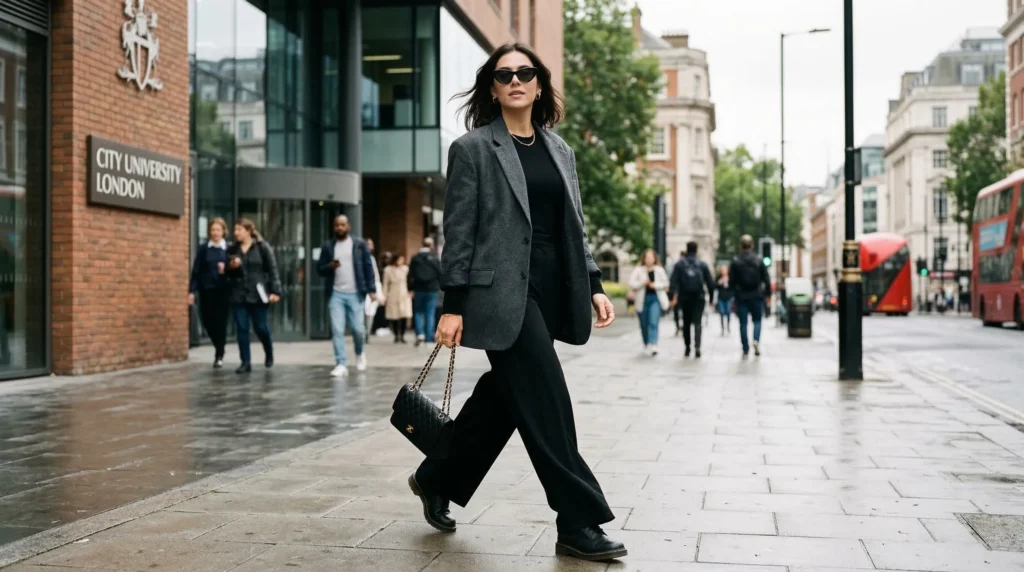 If sleek and modern is more your style, this one’s for you. A relaxed gray blazer over a cropped black top and wide-leg black trousers creates a look that’s minimal, fashion-forward, and quietly powerful. It’s the kind of outfit that makes people notice you walked in without being able to explain exactly why.