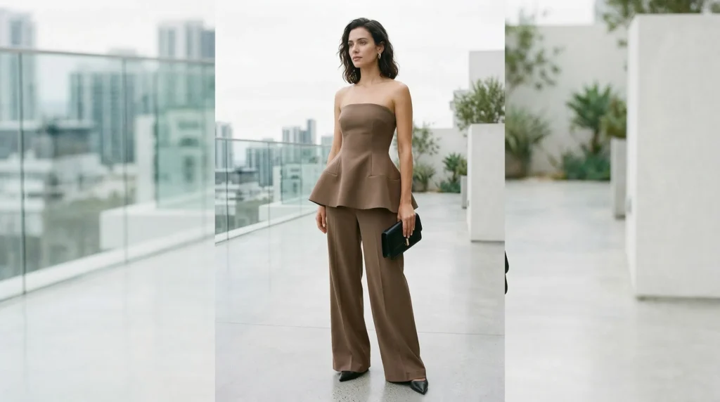 The peplum structure adds shape through the waist, and the long trousers bring elegance and movement that’s especially beautiful in photos. The soft taupe palette keeps everything understated, while the architectural tailoring gives the outfit a fashion-forward edge. A sleek black clutch and pointed heels anchor the look perfectly.