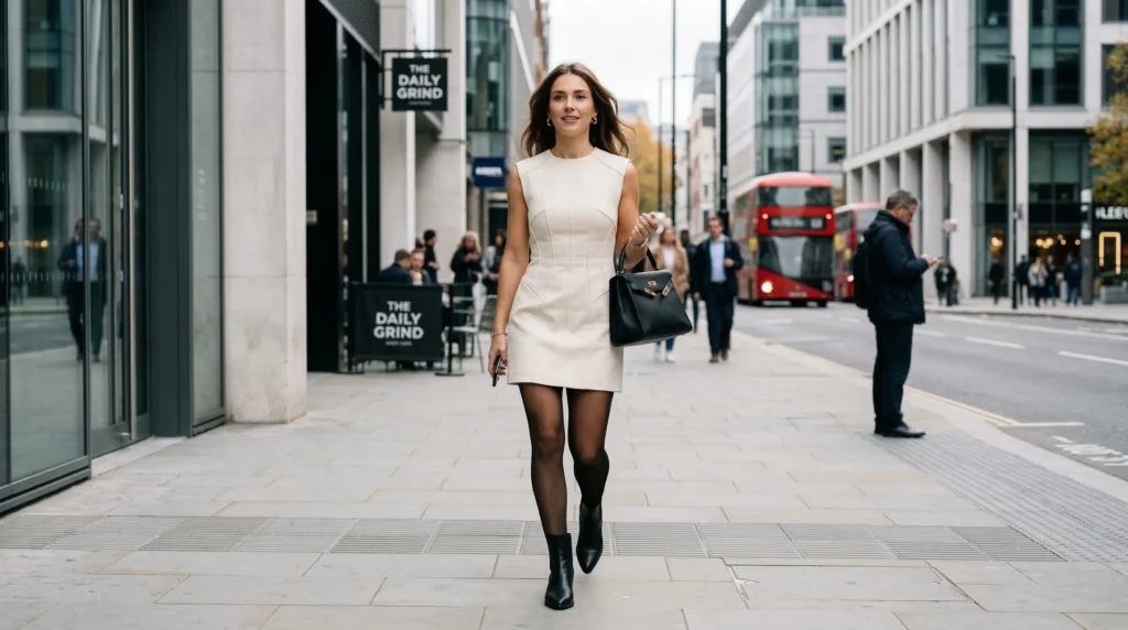Paired with sheer black tights and sleek ankle boots, the look takes on a sophisticated edge that works beautifully for city venues or modern university campuses. A structured black handbag maintains the monochrome elegance, and the whole outfit ends up feeling youthful without being underdressed.