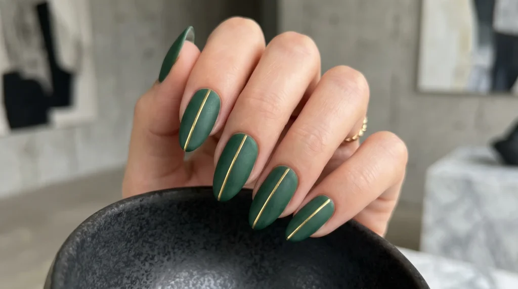 Matte green nails are recapturing their throne in 2026 — and this version earns its place at the top. Smooth almond shape, suede-like matte finish, with a razor-fine metallic gold stripe running through the center. That gold on matte green is a minimalist fantasy with just enough drama to catch the light without ever shouting for attention. Mood, mystery, and modernity in a single set.