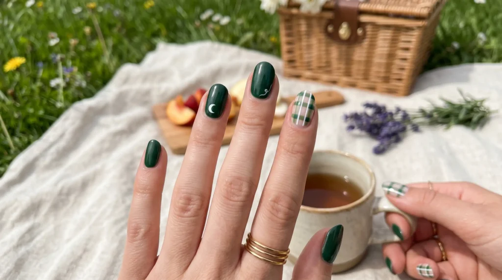 Deep forest green nails alongside nude nails with a green-and-white gingham print, finished with micro details like a tiny moon or swirl. It’s cozy-girl nail art at its finest — artsy and charming without being over-the-top. Ideal for spring picnics, brunch dates, or any time you need something lighthearted and on-trend.