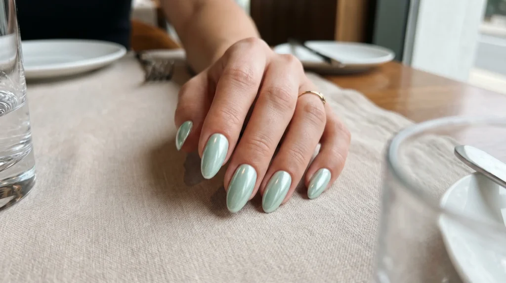 Pistachio-colored chrome — that soft, pale, almost mint-tinted green with a futuristic sheen. It catches the light most exquisitely: shiny but not gaudy, smooth but never icy. The almond shape at a medium length makes it comfortable enough for daily wear while the finish provides a genuinely unexpected touch.
