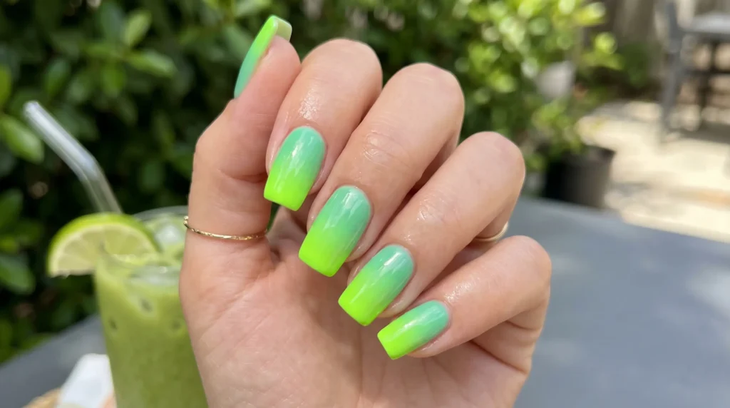 Bold nail art steps back in 2026 in favor of subtle accents and color work — and this lime ombre sits right in that philosophy. The gradient is the only design, and the gradient is enough. Two highly pigmented green polishes blended on a sponge before curing, sealed with a glass-like finish.