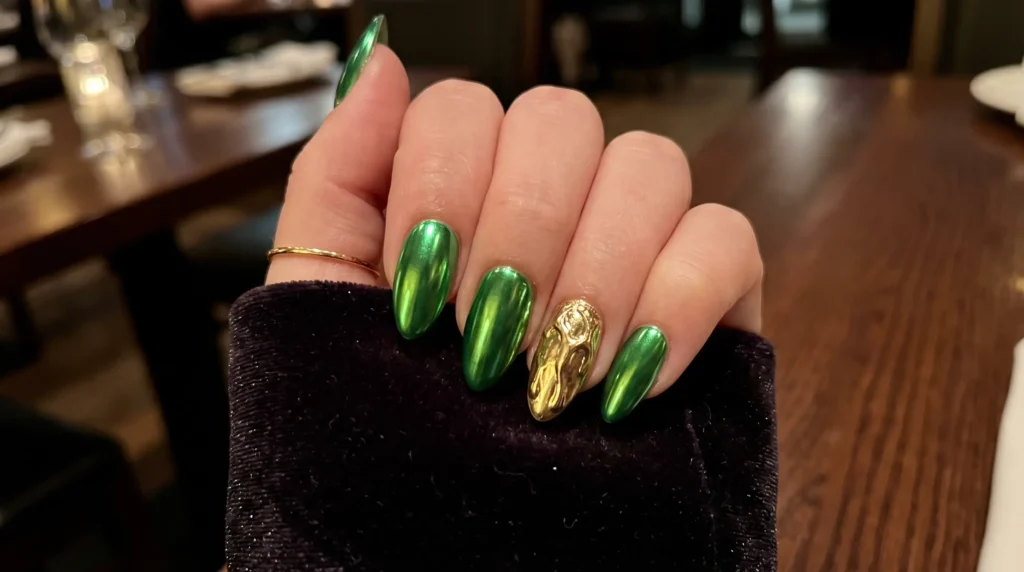 Green chrome nails with a molten gold accent nail — the contrast is the whole design. Green chrome is bold on its own. Gold chrome on a single accent nail takes the whole set somewhere that reads like a theme party for the best possible reason: confident, strong, main character.