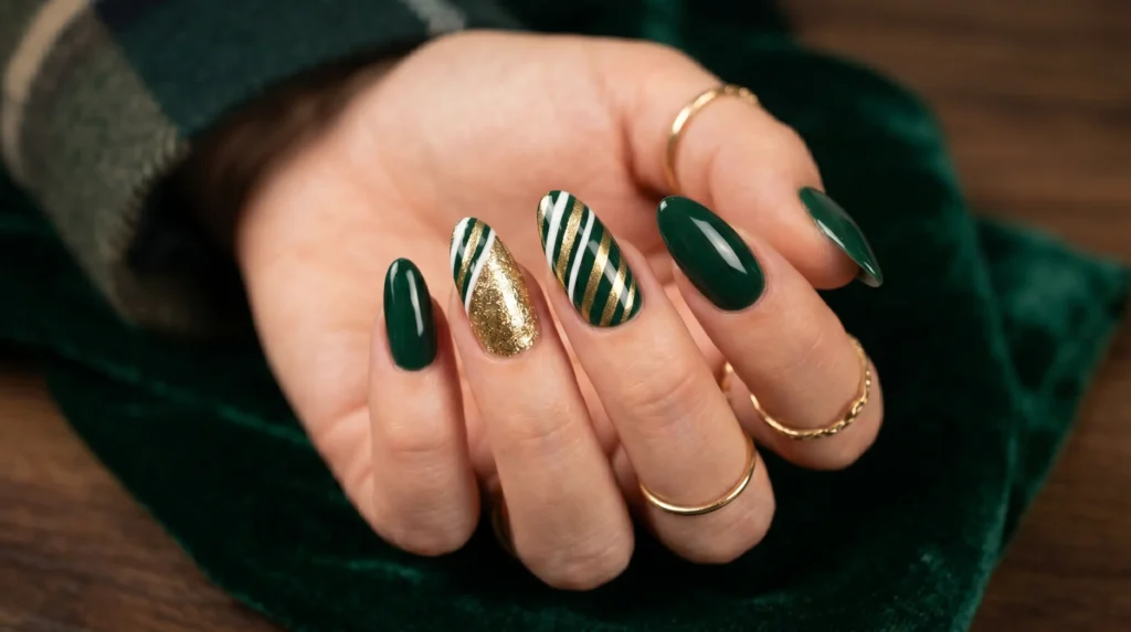 Deep green polish on most nails, gold glitter on the accent nail, and one finger with clean white-and-gold diagonal stripes against a green background. A bit candy-cane, a bit couture — and somehow it works year-round depending on how you wear it. Refined, upscale, full of personality.