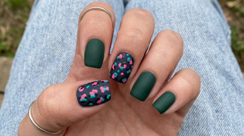 Matte forest green on most nails, with two statement nails featuring hot pink spots and teal leopard print. Early Y2K meets modern nail art. The matte texture makes it feel rich and velvety, and the animal print brings the attitude. It’s fun and fearless — bold in a specific, knowing way.