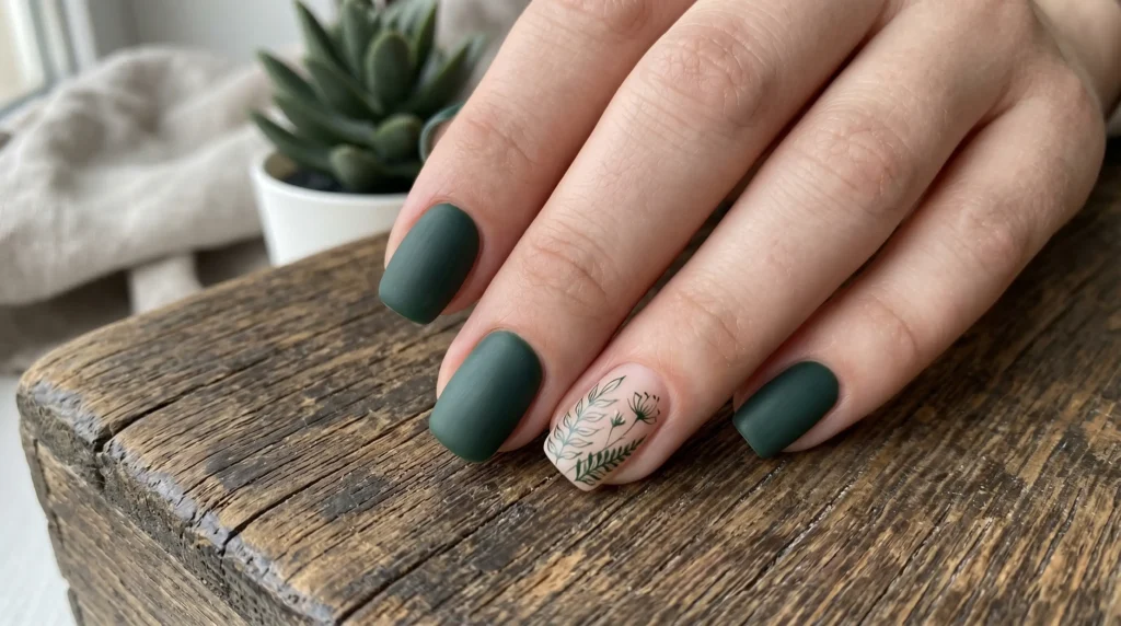 Forest green prevails on most nails, but the accent nail features a bare nude base with a delicate leafy botanical drawing — fragile line work against earthy solids. It’s sophisticated plant-lady energy. The juxtaposition of minimal negative space and natural-inspired art is very 2026 — we’re seeing much more nature-influenced nail art that’s elevated rather than cartoonish.