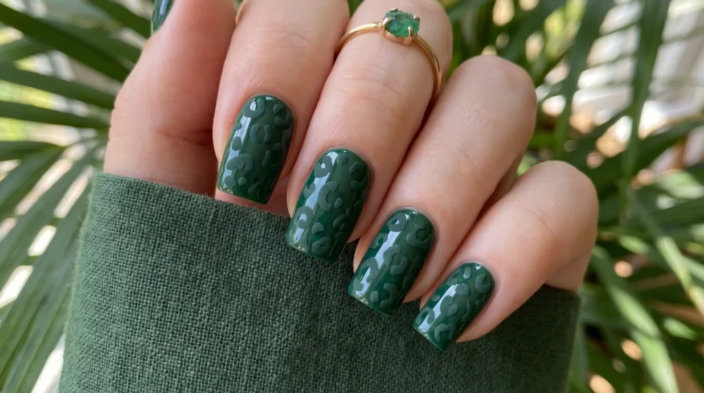 Glossy jungle green finish with slightly darker matte leopard spots — a tone-on-tone look that doesn’t feel over-the-top. Modern, squared, shiny, with a safari-meets-editor-cool energy. Green nail art without being a gimmick.